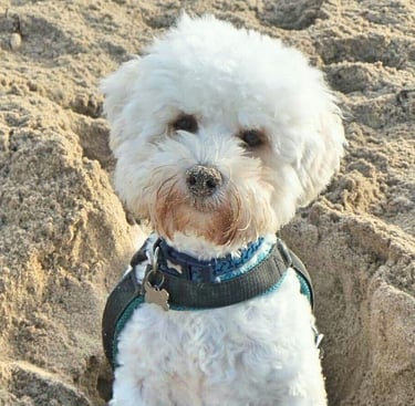 I’m Sharon, and this is Peanut, my playful Poochon pup. I also live with Tom, the cat, two new kittens, and also a friend’s dog, that I'm caring for during the day.